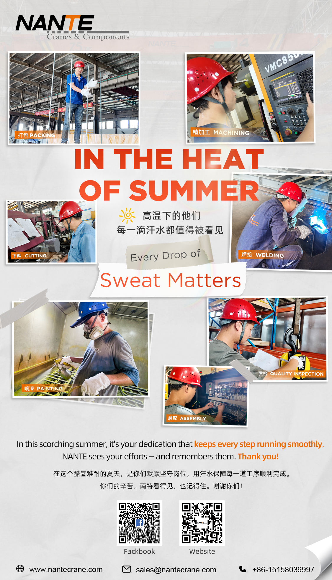 Début août, nous entrons à la fin de la Grande Chaleur (Dashu), l’un des 24 termes solaires. Dans la province du Zhejiang, c’est la période la plus chaude et la plus difficile de l’année. Les grues Nante évoluent dans l’industrie lourde, où les vastes espaces de production rendent impossible l’installation d’équipements de climatisation. De plus, les nombreuses machines-outils et opérations de soudage génèrent en continu de la chaleur, faisant monter inexorablement la température sur le chantier.